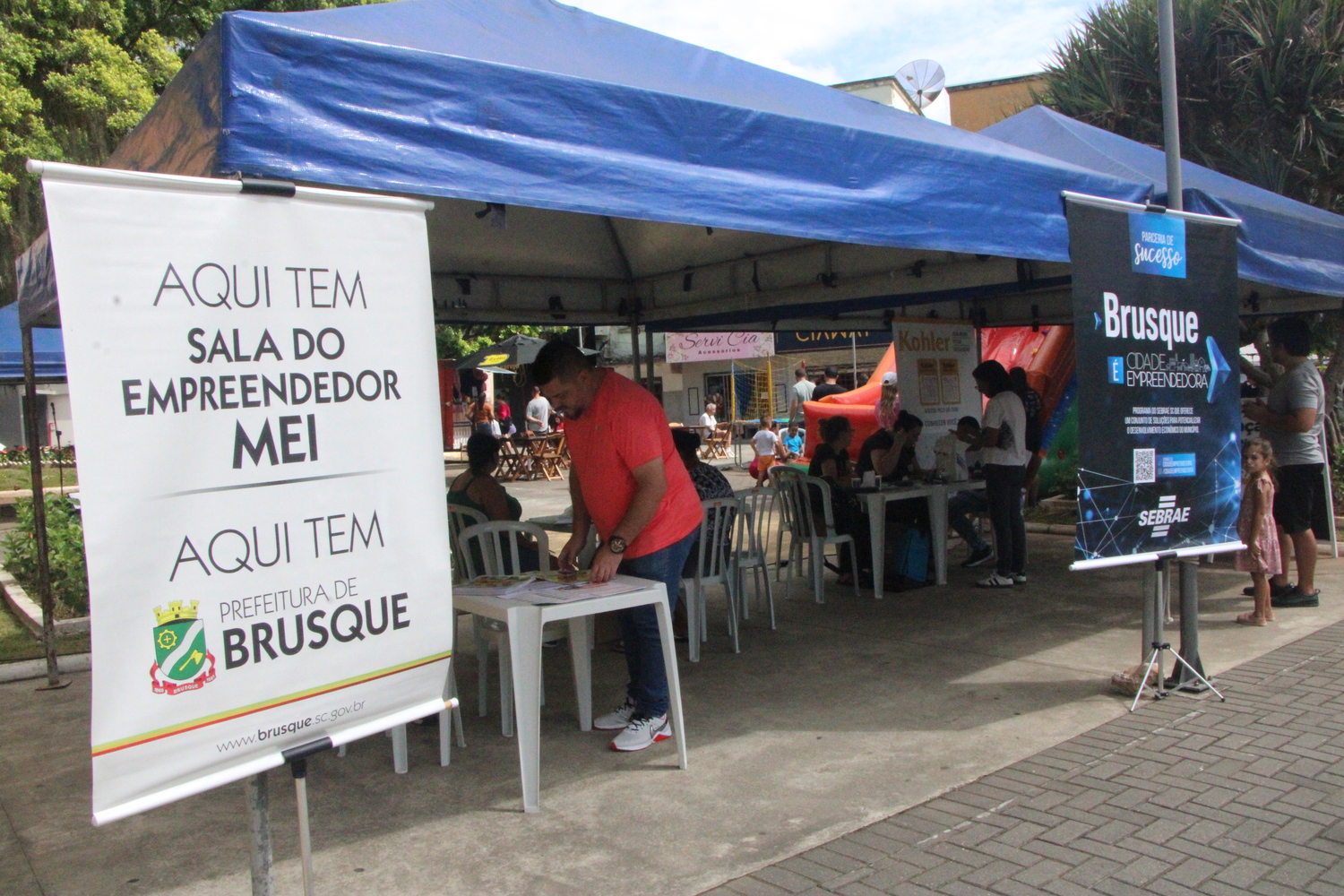 Entre os parceiros desta edição do Sábado Fácil estava a Sala do Empreendedor, da Secretaria de Desenvolvimento Econômico e Inovação da Prefeitura de Brusque, que levou orientações sobre a regularização do Microempreendedor Individual (MEI) para a praça.