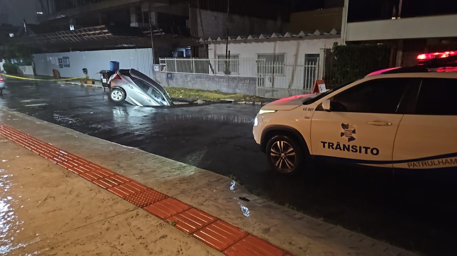 Um carro caiu dentro de uma cratera aberta pela chuva em Balneário Camboriú, na tarde de segunda-feira, 6. O motorista do HB20 teria desrespeitado a sinalização que interditou a via. O buraco se abriu na rua Uganda.