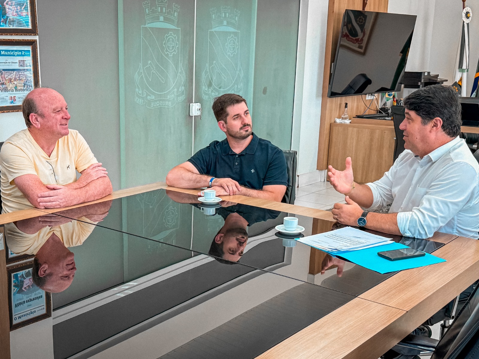 A agenda ocorreu na semana passada, no gabinete do prefeito André Vechi (PL). O vereador Rogério dos Santos (Republicanos) participou.