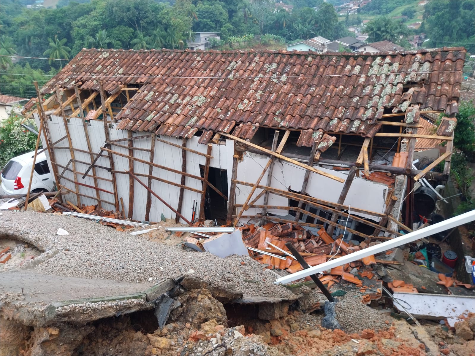 Carro cai em cratera aberta pela chuva em Balneário Camboriú